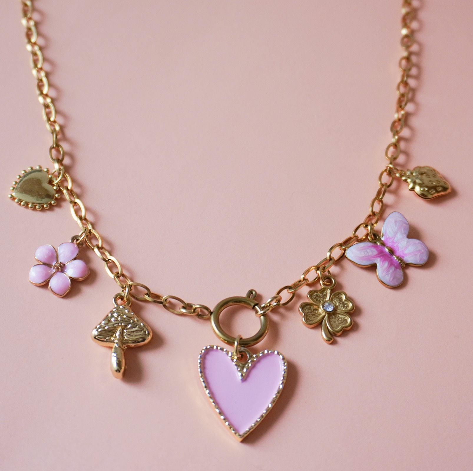 Collar Bloom celebra la belleza que florece. Diseñado con nuestra cadena dorada clasica en acero inoxidable y charms de diferentes materiales como acero inoxidable y rodio, como flor rosa, trébol de la suerte, mariposa, hongo, corazón y más, esta pieza es ideal para quienes quieren llevar un toque mágico y femenino en su día a día.